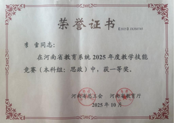 近日,从河南省总工会、河南省教育厅传来喜讯,马克思主义学院教师李雪凭借扎实的教学功底、创新的教学设计和精彩的视频展示,在众多参赛选手中脱颖而出,荣获一等奖,为学校和学院赢得了荣誉。